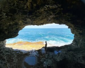 To get down there, you’ll head down a set of coral steps built back in 1912. It’s a bit steep, so if you’re shaky on your feet, take your time. Once you’re inside, the walls are a trippy mix of green and brown (that’s copper and iron oxidation, for the science geeks).The highlight? The “windows.” Large natural openings in the cliff face look straight out onto the Atlantic. On a rough day, the spray comes right through, and the sound of the waves booming against the rocks is something you’ll feel in your chest.Yes, You Can Swim (If the Sea Behaves)